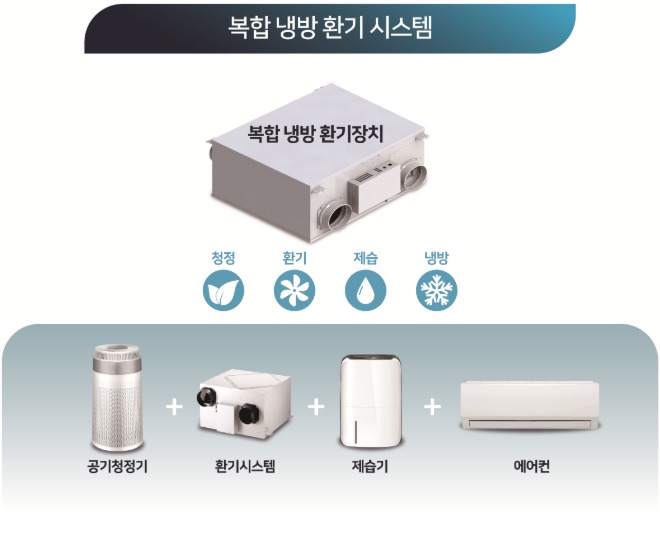 ‘복합 냉방 환기 시스템’은 냉방부터 제습, 환기, 미세먼지 제거까지 4개 기능을 한 번에 수행하는 ‘4 in 1’ 시스템이다. 실외기는 물론 에어컨, 공기청정기, 환기시스템, 제습기를 각각 설치할 필요가 없다. 청년과 신혼부부가 선호하는 소형평형에 걸 맞는 시스템이다.