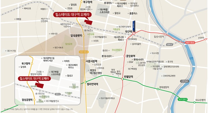 힐스테이트 대구역 오페라는 대구의 주거중심지로 꼽히는 침산생활권과 대구 최대 상권으로 꼽히는 중구 동성로생활권을 동시에 이용할 수 있다.