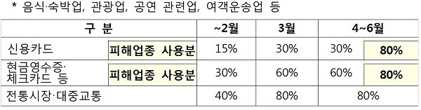 홍 부총리는 “공공부문 선결제·선구매 제도가 민간 부문에서 ‘착한 소비’로 확산하도록 적극 지원하겠다”며 “가계 선결제·선구매 활성화를 위해 피해 업종 지출에 대한 소득공제율을 4~6월에 일률적으로 80%까지 추가 확대하겠다”고 했다.