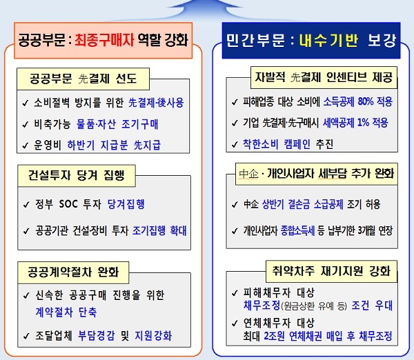 정부는 이에따라 최종 구매자로서 선결제·선구매 제도를 도입 시행하고, 하반기 예정된 정부·공공투자를 당겨 집행하기로 했다.