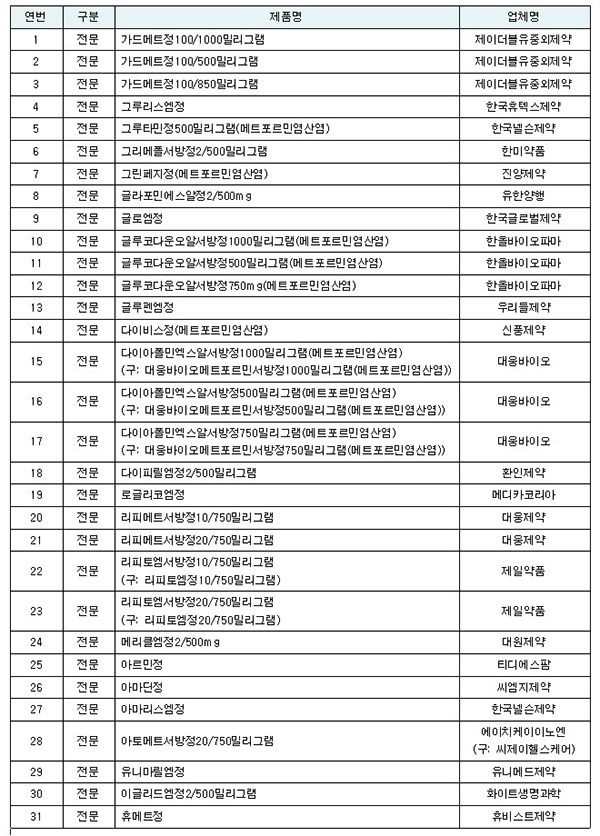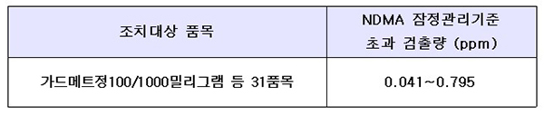 이에 288개 완제의약품 전체 중 31개 완제의약품에서 NDMA가 잠정관리기준을 초과 검출됨에 따라 이들 제품에 대해 잠정 제조 판매 및 처방중지를 결정했다.