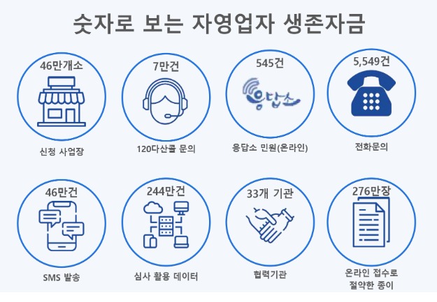 또한 저리대출이 아닌 현금지급 특성상 자영업자들의 관심도 많았는데, 해당부서 전화문의 5,549건, 응답소 민원(온라인) 545건을 비롯해 120다산콜을 통해서도 7만명이 넘는 자영업자가 상담을 받았다.