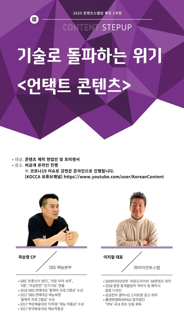 문화체육관광부와 한국콘텐츠진흥원(원장 김영준, 이하 콘진원)은 콘텐츠산업 분야 현업인 대상 직무교육 ‘2020년 콘텐츠 스텝업’의 연간일정을 공개하고, 오는 30일 ‘기술로 돌파하는 위기 <언택트 콘텐츠>’를 주제로 첫 특강을 진행한다.