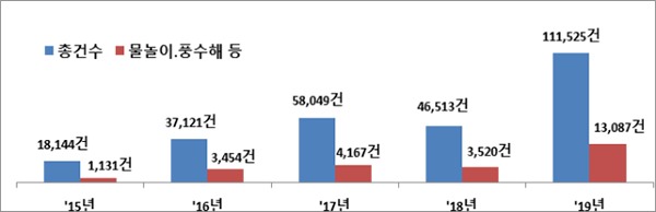 지난 5년동안 국민들의 안전신고 건수는 여름철 물놀이나 피서지, 풍수해와 관련해 2만 5000여건으로 꾸준히 증가하는 추세인데, 특히 지난해는 1만 3000여건으로 전년 대비 3.7배 대폭 증가했다.