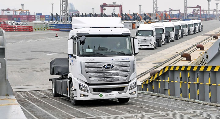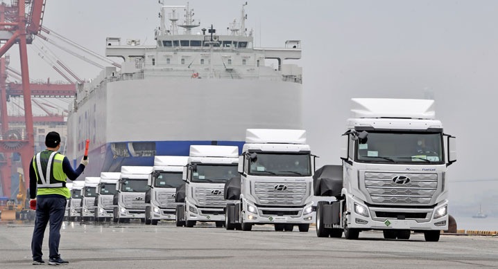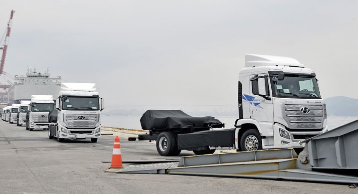 현대자동차는 6일 전남 광양시 광양항에서 세계 최초로 양산한 수소전기 대형트럭 ‘엑시언트 수소전기트럭(XCIENT Fuel Cell)’ 10대를 선적하고 스위스로 수출했다고 밝혔다.
