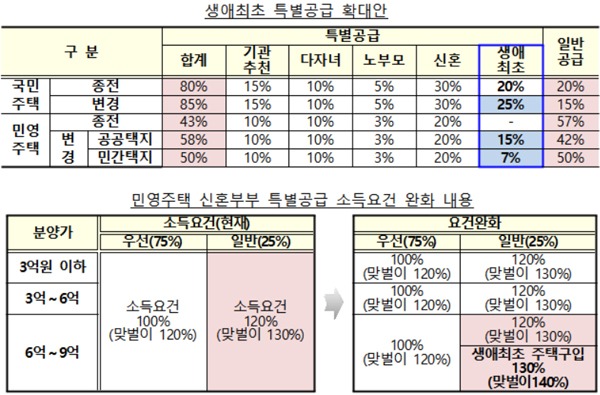 반면, 민영주택에 생애최초 특별공급을 신설하고 신혼부부 특별공급 기준을 완화하는 등 생애최초 주택 마련은 지원하기로 했다.
