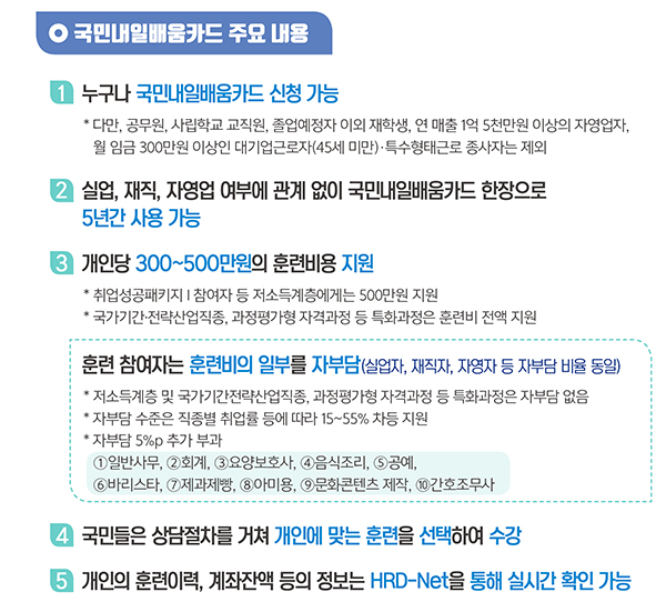 한편 이번에 선정된 훈련과정은 16일부터 수강할 수 있으며 훈련과정에 참여하기 위해서는 직업훈련포탈(HRD-Net) 또는 고용센터를 통해 국민내일배움카드 발급을 신청해야 한다.