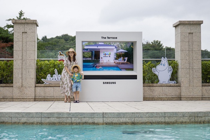 삼성전자가 아웃도어용 라이프스타일 TV ‘더 테라스(The Terrace)’를 국내에서는 처음으로 서울신라호텔 야외 수영장 ‘어번 아일랜드’ 키즈풀에 설치했다.