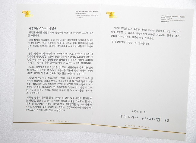 7일 경기도에 따르면 이재명 지사는 이런 내용을 담은 편지를 이날 더불어민주당 대표단과 소속 국회의원 176명 전원에 보내 ‘대부업 법정 최고금리 인하’에 대해 적극적인 관심과 협력을 호소했다.