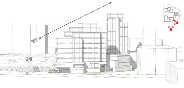 건물은 중간마당을 품은 3개 동으로 배치해 열린 스카이라인을 만들고 바람길을 확보한다. 주거 동에는 중간중간에 공유테라스, 옥상텃밭 같은 공유공간을 조성해 입주민 커뮤니티가 활성화될 수 있도록 한다.