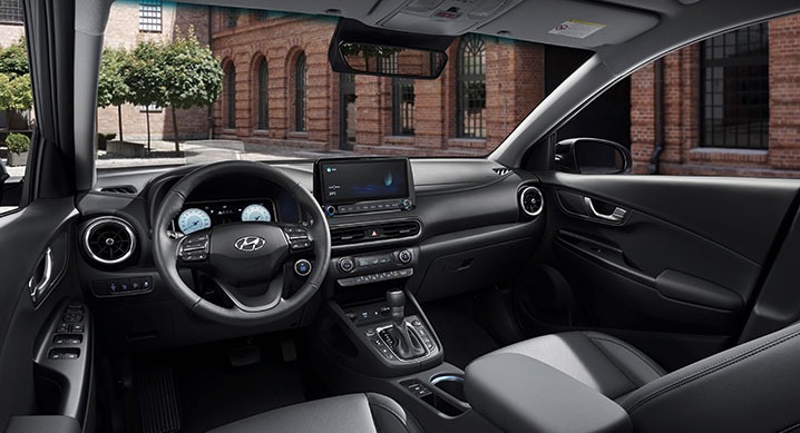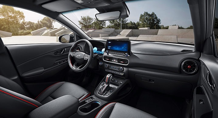 더 뉴 코나의 내장 디자인은 ▲운전자의 시인성을 높이고 하이테크한 인상을 가미한 10.25인치 대화면 디스플레이와 클러스터 ▲반광 크롬 느낌의 가니쉬 ▲앰비언트 라이트 컵홀더 등이 적용돼 경쾌함과 동시에 고급감을 향상시켰다. 여기에 전체적으로 수평적 구조가 강조되도록 센터페시아를 구성함으로써 공간이 시각적으로 확장되는 듯한 효과를 구현했다.