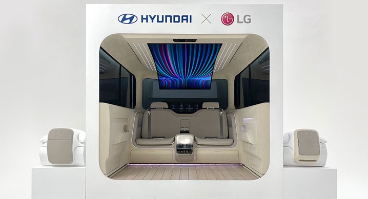 LG전자와 협업으로 제작된 '아이오닉 콘셉트 캐빈'에는 ▲슈즈케어기 ▲커피머신 ▲의류케어기 등 고객 경험 구성품이 탑재됐으며, 차량 천장에 설치된 ▲플렉서블 올레드 디스플레이를 통해 어떠한 자세에서도 편안하게 콘텐츠를 즐길 수 있도록 디자인 되었다.