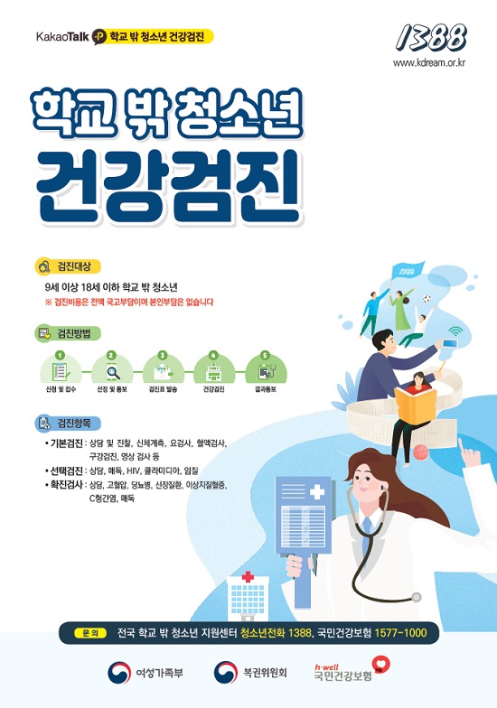 만 9세 이상 18세 이하 학교 밖 청소년이면 누구나 인근 병원 등 지정검진기관을 통해 전액 국고 지원(본인 부담 없음)으로 무료 검진을 받을 수 있다.
