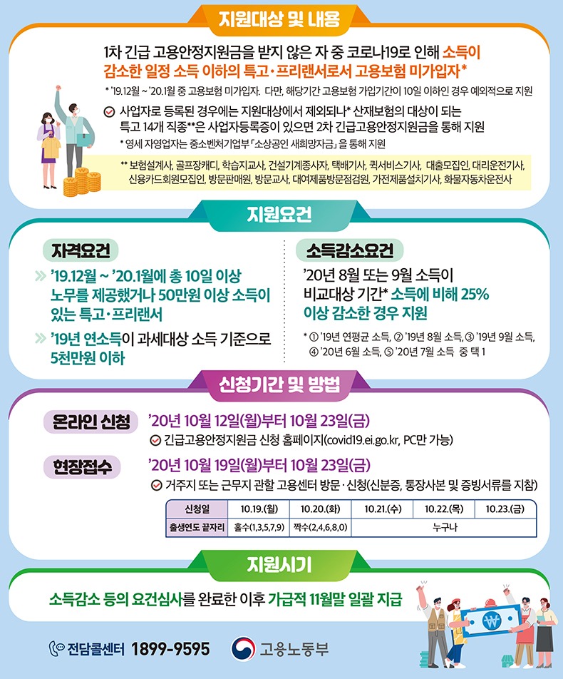 대상은 1차 긴급고용안정지원금을 지원받지 못한 특고·프리랜서 가운데 2019년 12월~2020년 1월 중 고용보험 미가입자로, 다만 해당기간 고용보험 가입기간이 10일 이하인 경우는 예외적으로 가능하다.