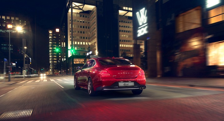후면부는 쿼드램프로 제네시스의 정체성을 명확하게 표현했으며 듀얼 머플러 (좌ㆍ우 배기구)와 차체와 동일한 색상의 디퓨저(Diffuser)로 고성능 세단의 모습을 완성했다.