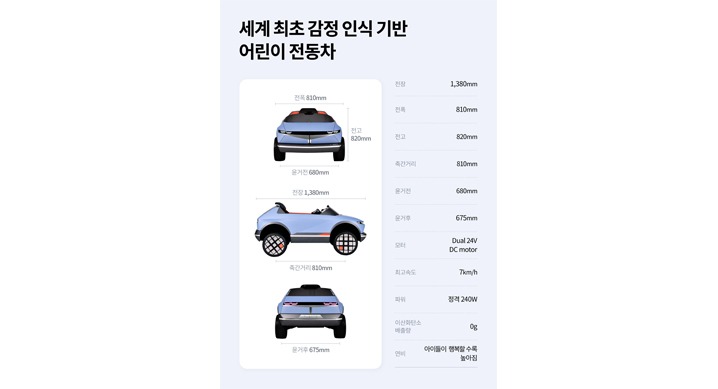 어린이 전동차의 상세 제원은 전장 1,380 mm, 전폭 810mm, 전고 820mm로, 미취학 어린이에게 알맞게 설계된 아담한 사이즈이며, 연비는 “아이들이 행복할수록 높아짐”으로 표기되어 있어 앞으로 공개될 영상에 대한 궁금증을 자아낸다.