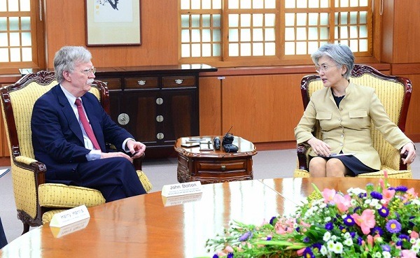 외교부에 따르면 강경화 외교부 장관과 볼튼 보좌관은 24일 오후 서울 도렴동 청사에 면담을 갖고, 다양한 한미동맹 강화 방안 및 역내·글로벌 정세, 한반도의 완전한 비핵화를 통한 항구적 평화체제 구축 등 상호 관심사에 대해 논의했다.