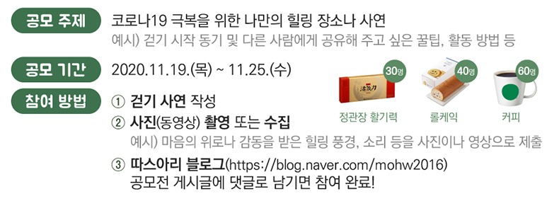 공모 내용은 걷기를 시작한 동기, 다른 사람들에게도 공유해 주고 싶은 힐링 장소나 걷기 아이디어 등 다양한 내용을 작성하거나 마음의 위로를 받았던 풍경, 소리 등을 사진이나 영상으로 함께 제출하면 된다.