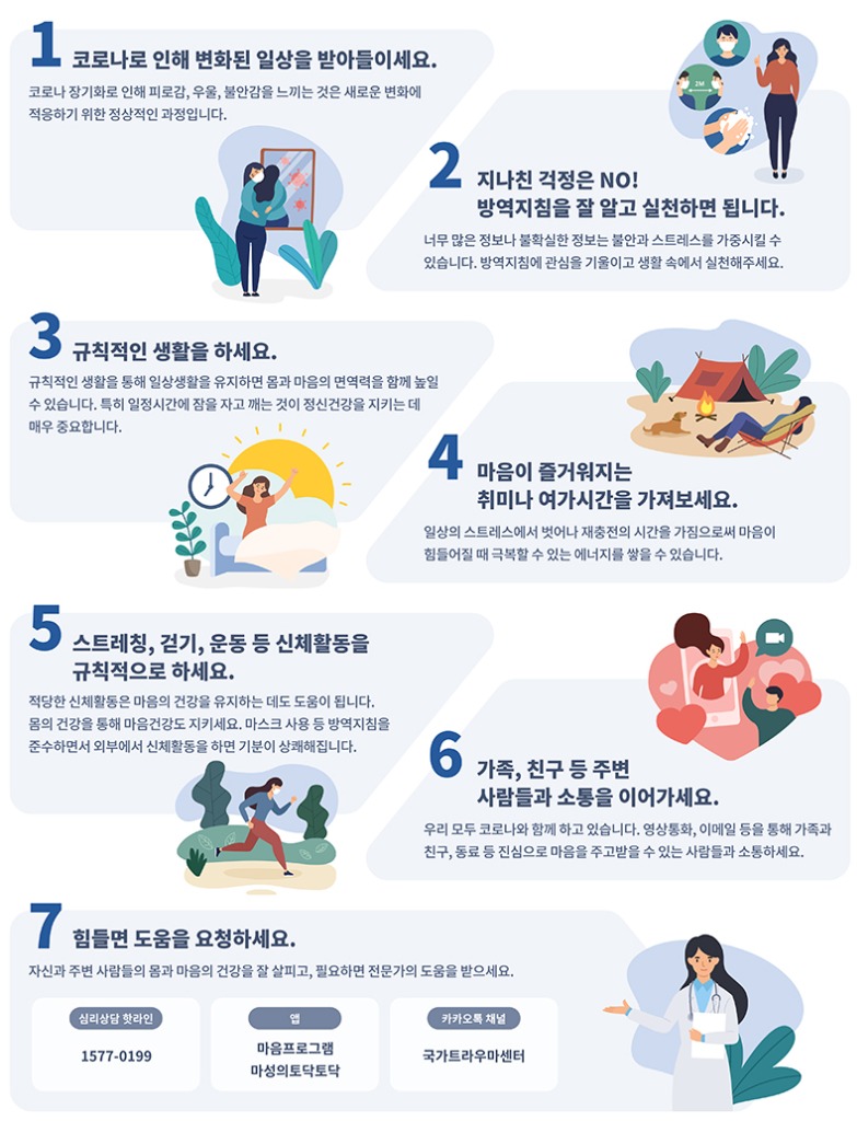 보건복지부는 ‘코로나19와 함께하는 마음 건강 지키는 7가지 수칙’(이하 ‘마음 건강수칙’)을 배포하고, 25일까지 ‘마음 걷기’ 기획 행사를 실시한다고 밝혔다.