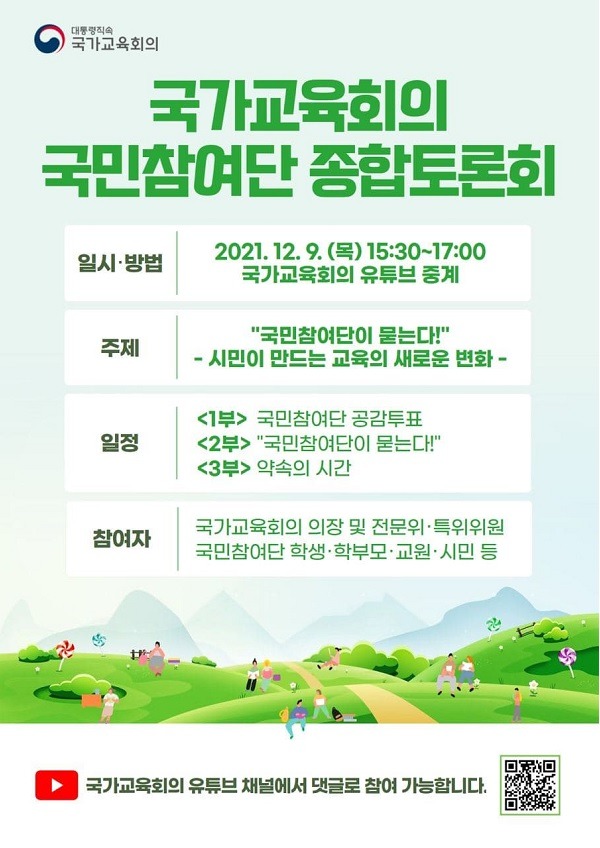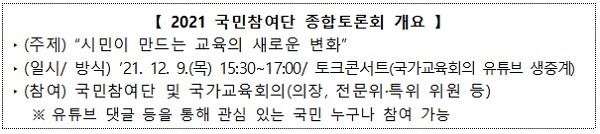 대통령직속 국가교육회의는 오는 9일 ‘시민이 만드는 교육의 새로운 변화’를 주제로 2021 국민참여단 종합 토론회를 온라인으로 개최한다고 8일 밝혔다.