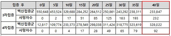 28일 중앙방역대책본부(방대본)에 따르면, 이스라엘에서 3차접종과 4차접종 후 사망률을 비교 연구한 결과 60세 이상 연령층에서 3차접종 완료군과 비교했을 때 4차접종 완료군의 사망률이 감소한 것으로 나타났다.
