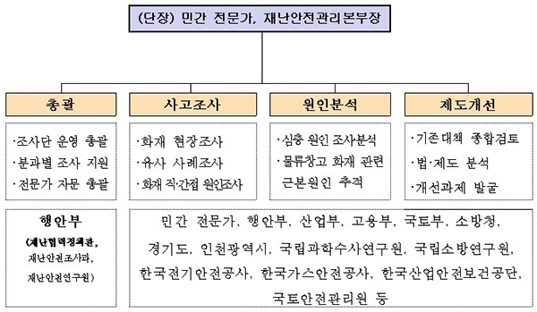 이날 출범하는 조사단은 민세홍 가천대학교 교수와 김성호 행정안전부 재난안전관리본부장을 공동 단장으로 한다. 학계·업계 민간 전문가와 행안부·산업부·고용부·국토부·소방청 등 중앙부처, 경기도·인천광역시 공무원 등이 참여해 오는 8월 말까지 약 3개월간 운영된다.