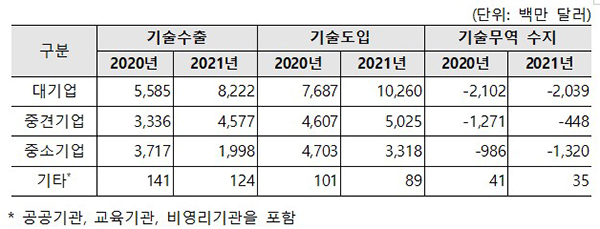 반면 중소기업은 기술수출액과 기술도입액이 각각 46.3%, 29.5% 감소하면서 기술무역 적자 규모가 13억 2000만 달러로 증가했다.