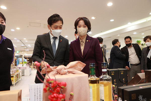 이영 중기부 장관과 김주현 금융위원장이 11일 서울 양천구 중소기업유통센터에서 정책매장을 둘러보고 있다. [사진=중소벤처기업부]