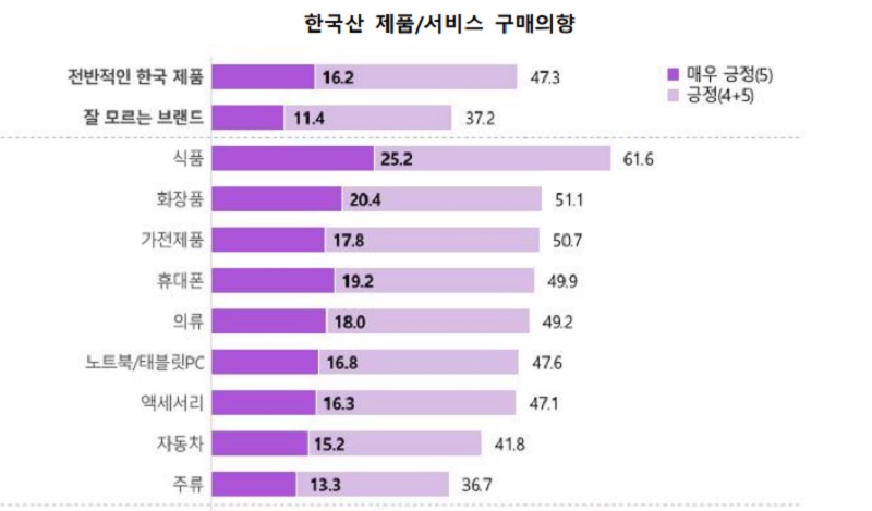 실태조사에 따르면 한국 문화 콘텐츠를 경험해본 외국인 10명 중 6명 가량이 식품, 화장품, 가전 같은 한국산 제품과 서비스 구매에 영향을 미친다고 답했고, 10명 중 4명 가까이는 잘 모르는 브랜드라도 한국산이면 구매하겠다고 응답했다.