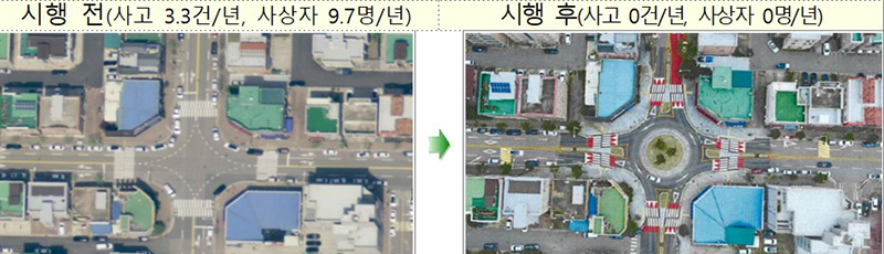 먼저 회전교차로 설치 전 3년간 연평균 교통사고 사망자 수는 2.7명이었으나 설치 후인 2021년에는 1명으로 63% 감소했다.
