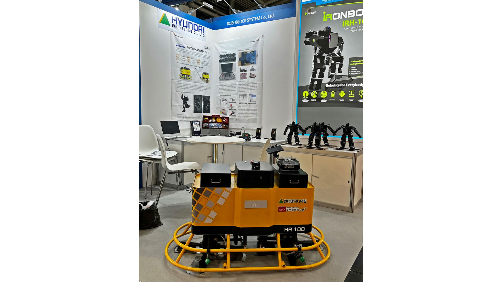 한국로봇산업진흥원(원장 손웅희)이 마련한 한국 로봇 공동관 부스에 전시되는 AI 미장로봇은 바닥 미장 작업의 무인화를 목적으로 개발된 스마트 건설 장비다. 타설된 콘크리트 바닥면을 3D 스캐너로 정밀 측량하고, 평활도가 기준치에서 벗어나는 부분을 4개의 미장날이 장착된 2개의 모터를 회전시켜 미장 작업한다.