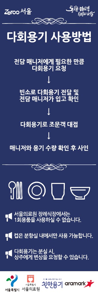 서울시는 7월 3일(월)부터 서울의료원 장례식장 내 다회용기 전면 사용으로 ‘일회용기 없는 장례식장’을 운영한다고 밝혔다.
