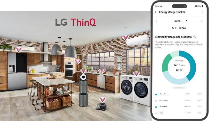 한편 LG 씽큐 앱(App)은 ‘가전 에너지 모니터링(Energy Usage Tracker)’ 서비스를 제공한다. 이 서비스는 LG 씽큐 앱에 등록된 LG 가전제품의 전력 사용량과 전월 사용량을 보여준다. 사용자가 월간 전력 사용량 목표를 설정하면 현재까지 사용한 전력량을 실시간으로 보여줄 뿐 아니라 월말까지 예상되는 사용량도 예측해 준다.