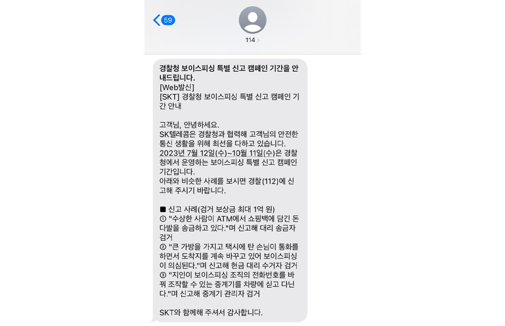 SKT는 이를 지원하기 위해, 고객 대상으로 보이스피싱 신고 사례를 공유하고 유사 사례 목격 시 경찰(112) 신고를 독려하는 보이스피싱 특별 신고 안내 캠페인을 진행하게 되었다.