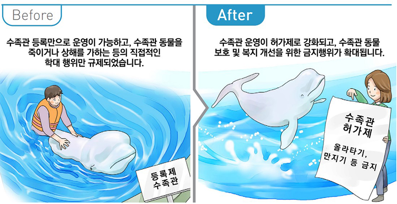 특히 관할 시·도에 등록만으로 가능했던 수족관 등록제도를 허가제로 전환하고 수족관 동물 올라타기와 만지기 등 동물복지를 저해하는 행위 또한 금지한다.
