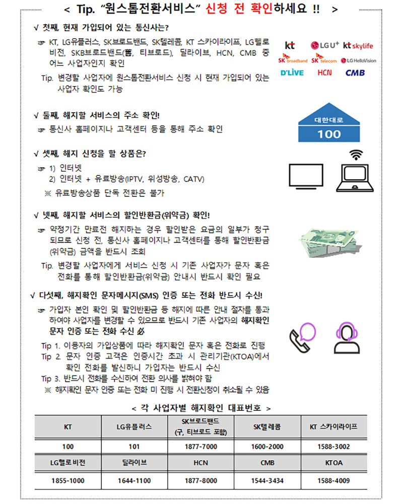 ‘원스톱전환서비스’란 초고속인터넷과 유료방송 결합상품서비스 이용자가 사업자를 변경하고자 할 때 기존사업자에게 별도의 해지 신청을 하지 않고 신규사업자에게 서비스전환 신청만 하면 해지와 개통을 한 번에 처리해 주는 서비스다.