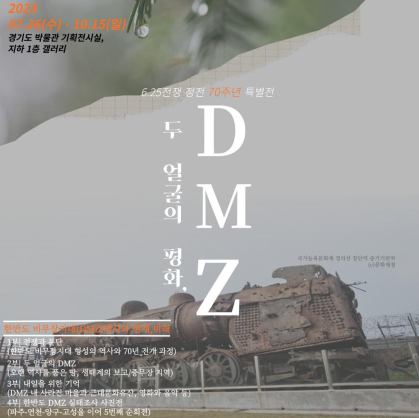 문화재청은 경기도, 강원특별자치도와 함께 7월 26일부터 10월 15일까지 경기도박물관 기획전시실(경기도 용인시)에서 6ㆍ25전쟁 정전 70주년을 맞아 한반도 비무장지대 실태조사(2020~2021)를 하면서 확보한 사진과 비무장지대 내 수습유물 등 500여 점을 공개하는 ‘두 얼굴의 평화 DMZ’ 특별전을 개최한다.