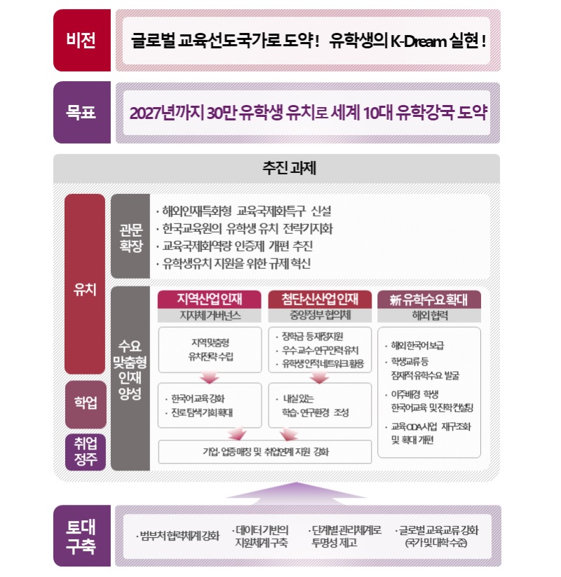 교육부는 ‘유학생 30만 명 유치를 통한 세계 10대 유학강국 도약’을 목표로, 단계별 전략을 제시했다.