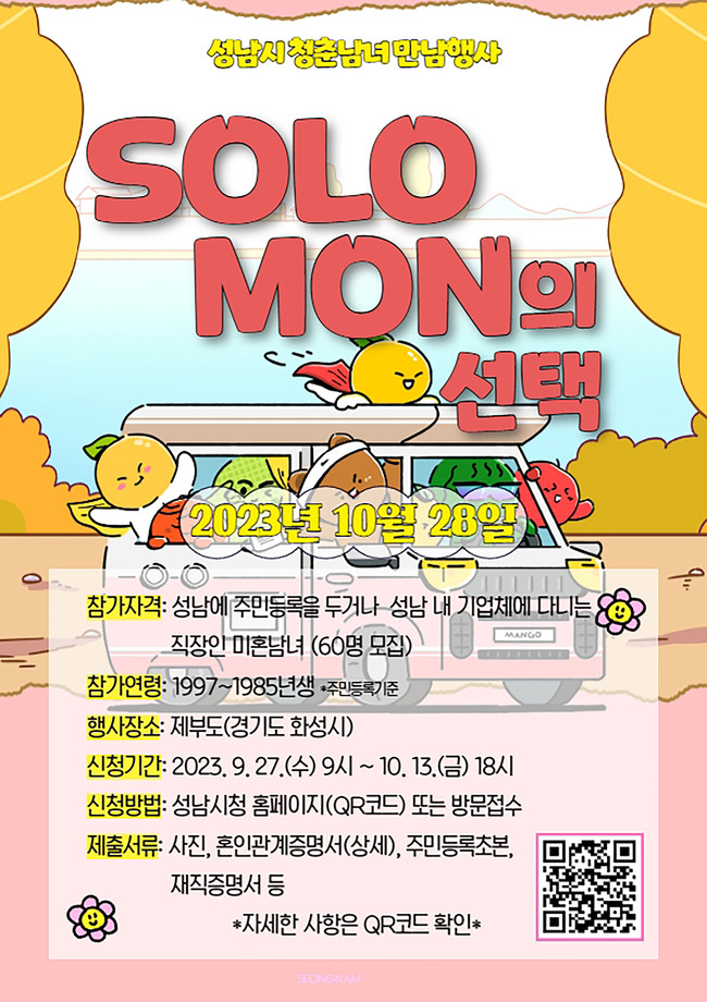 성남시는 1·2차 개최한 미혼남녀 만남 자리 ‘솔로몬(SOLOMON)의 선택’ 행사를 3차례 더 열기로 한 가운데 이를 홍보하기 위해 9월 4일 판교 거리로 나섰다.