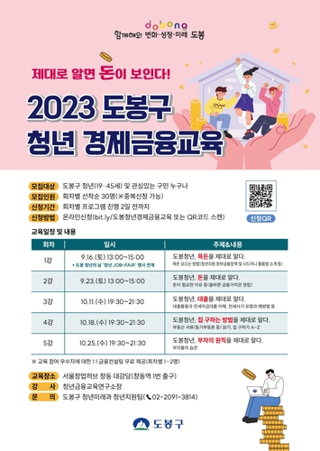 도봉구가 사회초년생 등 청년의 실전 경제금융지식 함양과 안정적인 자산 관리를 지원하기 위해 오는 9월 16일부터 10월 25일까지 서울창업허브 창동 대강당에서 '청년 경제금융교육'을 운영한다.