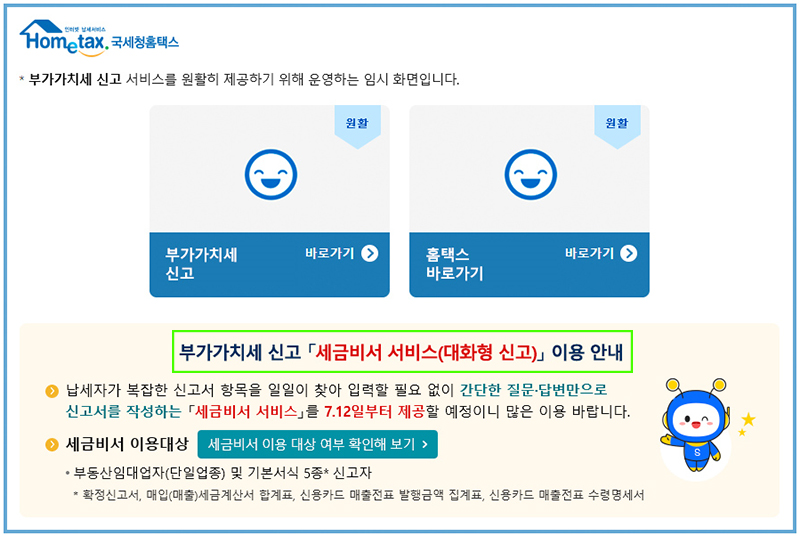 한편 ‘세금비서’ 서비스는 홈택스 누리집에서 이용할 수 있으며, ‘세금신고>부가가치세>일반과세자 또는 간이과세자 탭>정기신고(세금비서 서비스)’를 통해 접속이 가능하다.
