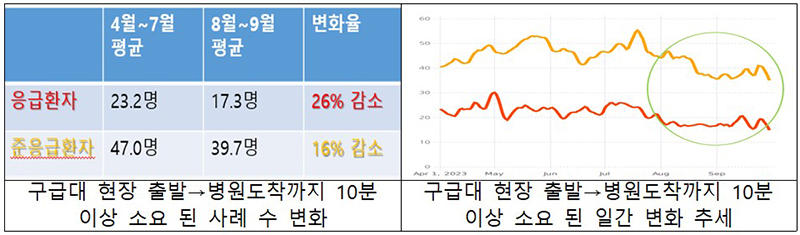 이에 119구급대원이 ‘응급증상’으로 분류한 환자가 병원에 수용되기까지 10분 넘게 걸린 사례 수는 하루 평균 17.3명으로, 대책이 시행되기 전인 4월부터 7월까지 하루 평균 23.2명에 비해 26% 감소했다.