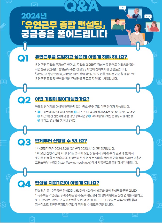 - 고용노동부, 2024년 유연근무 종합 컨설팅 참여기업 모집(3.26.~4.12.)