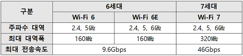 와이파이 7은 와이파이 6E 등 기존과 동일한 대역을 사용하나 와이파이 6E 대비 채널 대역폭 2배 확대, 변조 및 스트리밍 방식 개선, MLO 도입 등으로 속도가 와이파이 6/6E 대비 최대 4.8배 향상될 수 있는 표준으로 알려져 있다.