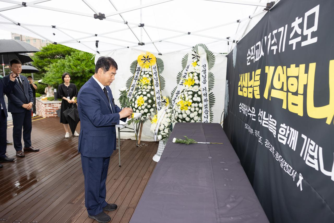 이정선 교육감이 16일 시교육청에 마련된 순직교사 1주년 추모공간을 찾아 헌화하고 묵념했다. 이 교육감은 이 자리에서 정당한 교육활동의 보호와 교육활동 침해 예방의 중요성을 강조했다.