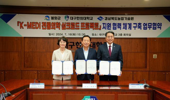 경상북도농업기술원은 봉화군, 대구한의대학교와 경북 약용작물 고부가가치화를 위해 16일 경산시에 있는 대구한의대학교에서‘K-MEDI 전통 의학 실크로드 프로젝트’ 추진을 위한 상호 협력 양해각서를 체결했다.