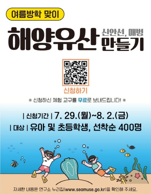 국가유산청 국립해양유산연구소(이하 ‘연구소’)는 여름방학을 맞아 유아 및 초등학생을 대상으로 한 온라인 체험교육 「해양유산 만들기」에 참여할 어린이 400명을 7월 29일 오전 10시부터 8월 2일까지 연구소 누리집(www.seamuse.go.kr)에서 선착순으로 모집한다.
