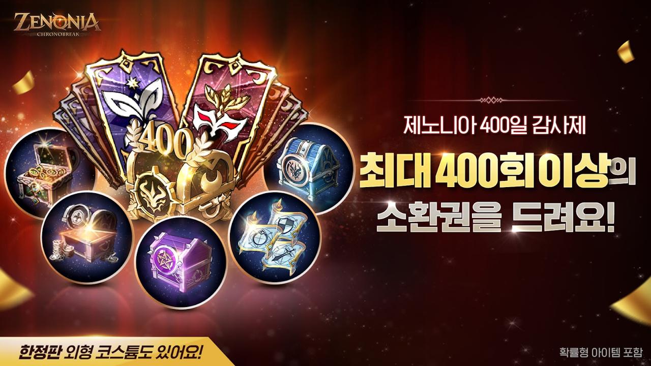 국내 출시 400일을 기념해 다양한 이벤트도 펼쳐진다. 다음달 8일까지 월드 보스 ‘카즈로갈’ 또는 ‘안티온’을 처치하면 ‘코스튬 및 페어리 소환권’, ‘봉인 선택 상자’ 등 주요 아이템이 푸짐하게 들어 있는 ‘안티온의 400일 상자’를 획득할 수 있다. 다음달 14일까지 특정 대륙에서 몬스터를 처치하면 ‘400일의 흔적’ 아이템을 얻을 수 있고, 이를 활용해 ‘젤로스의 장신구 강화 주문서’, ‘영원한 동반자 외형 코스튬’ 등을 획득할 수 있다. ‘젤로스의 무기 및 방어구 강화 주문서’ 등을 얻을 수 있는 특별 출석 이벤트도 같은 기간 진행된다. 제노니아의 상세한 업데이트 및 이벤트 소식은 공식 커뮤니티를 통해 확인할 수 있다.