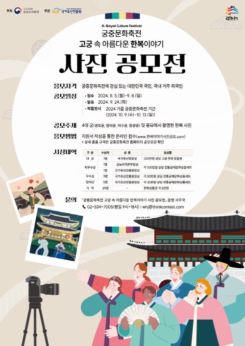 국가유산청 궁능유적본부는 국가유산진흥원(원장 최영창)과 8월 5일부터 9월 8일까지 ‘고궁 속 아름다운 한복 이야기’를 주제로 한 사진 공모전을 개최한다.