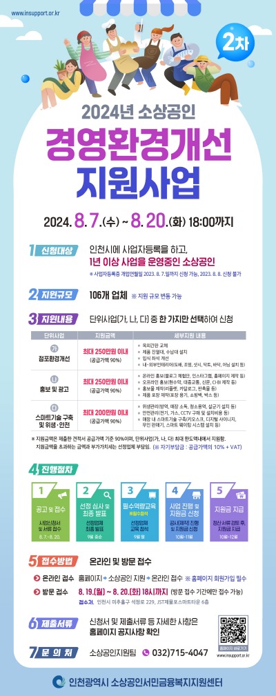 인천광역시는 지역 소상공인들의 경영 안정화를 도모하기 위해 오는 8월 20일까지‘2024년 2차 소상공인 경영환경개선 지원사업’대상자를 모집한다고 밝혔다.